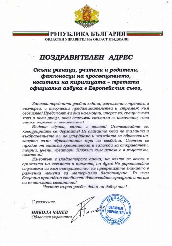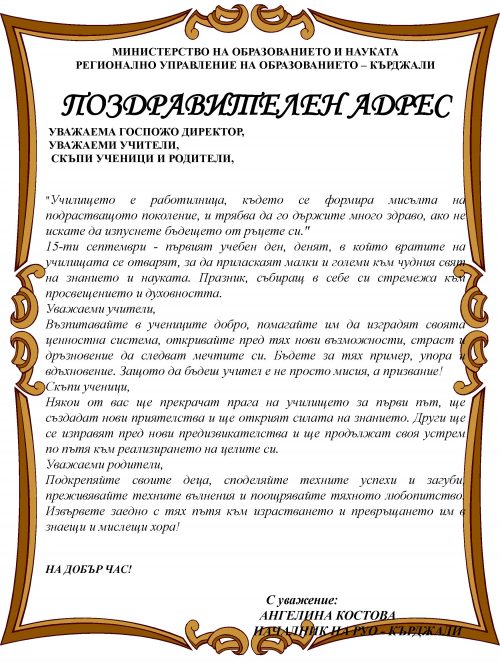 Петнадесети септември е! Един ден с необикновен статут в празничния календар на България. Новата учебна година бе открита тържествено в ОУ „Св. Св. Кирил и Методий” гр. Кърджали. Изпълнен с позитивни емоции е първият учебен ден за най-малките – първокласниците на. В тяхна подкрепа са и всички други присъстващи ученици в нашето училище. Дворът на училището оживя от грейналите лица на учениците, от вълнението на първокласниците, от радостните сълзи в очите на родителите, от усмивките на учителите, от песни и стихове. Директорът на училището – г-жа Марияна Пеева поздрави учениците и техните родители по повод откриването на новата учебна година. Гости на празника бяха г-жа Виолета Кавръкова, старши счетоводител на Областна администрация – Кърджали, г-н Себахтин Риза, секретар на община Кърджали, г-жа Николина Иванова, член на Обществения съвет към училището, г-жа Ширин Хюсеин – родител на първокласник. Поздравителен адрес за началото на учебната година изпрати г-жа Ангелина Костова – началник на РУО – Кърджали.