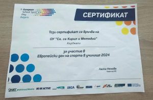 ОУ „Св. Св. Кирил и Методий“гр. Кърджали получи сертификат за участие в 10-тото юбилейно издание на Европейски ден на спорта в училище!